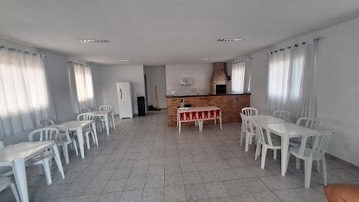 Salão de festas completo com churrasqueira, geladeira, mesas, cadeiras, fogão e micro-ondas