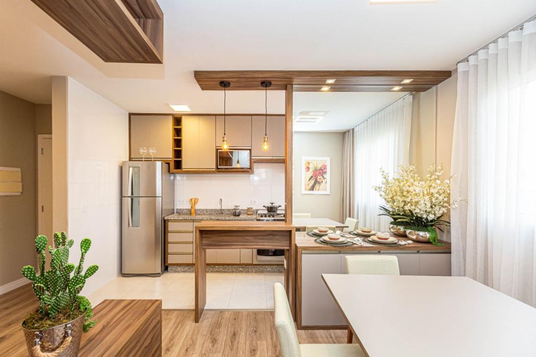 Cozinha e área de serviço integradas com móveis planejados, otimizando o espaço e a funcionalidade.