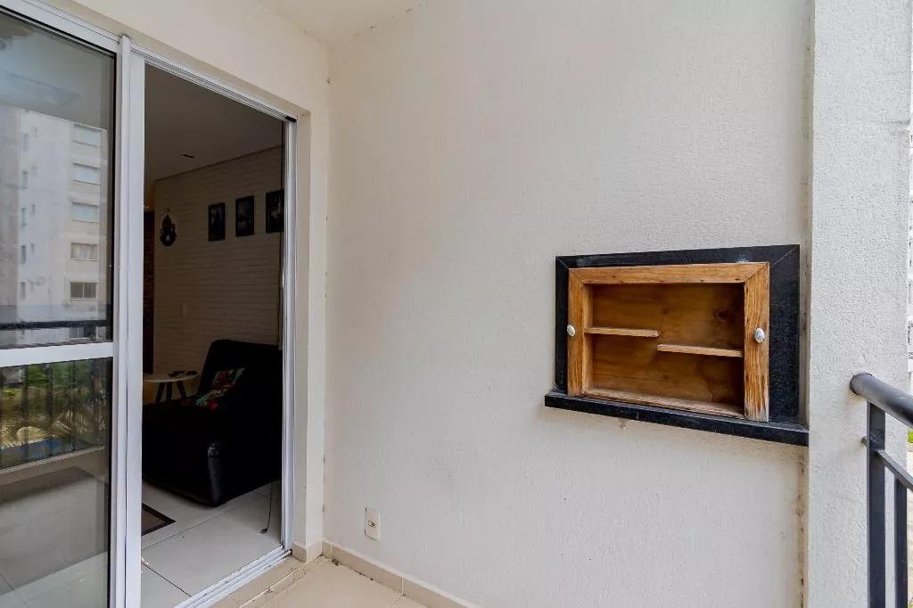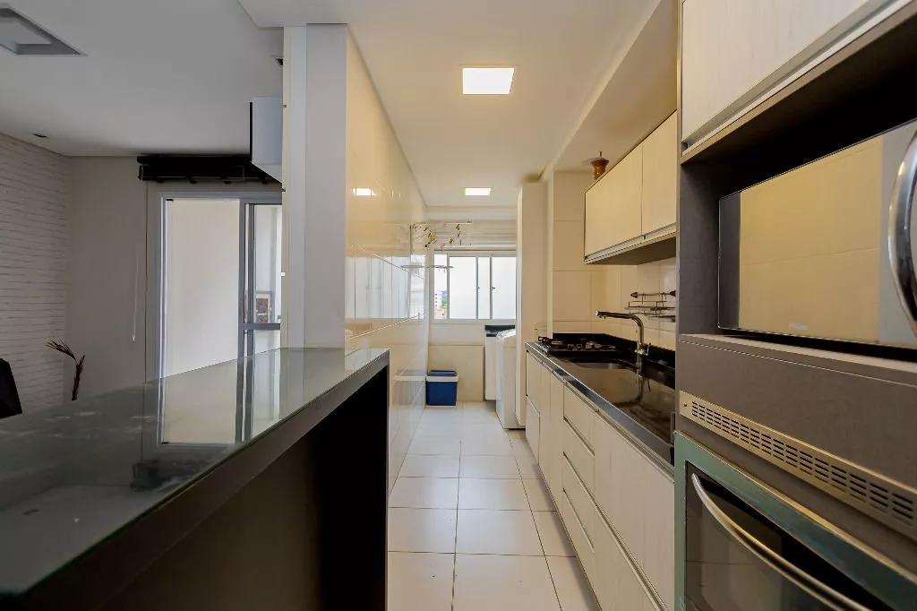 Geladeira, forno elétrico, microondas, cooktop, máquina de lavar, mesa com cadeiras, painel para TV, box no banheiro, cortinas, lustres e chuveiro a gás.
