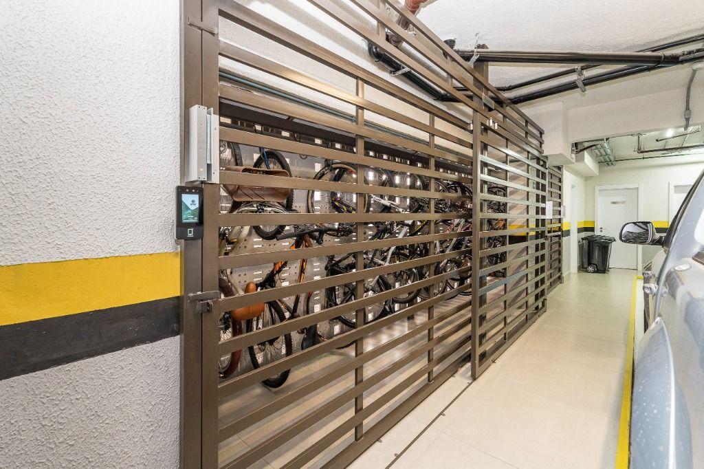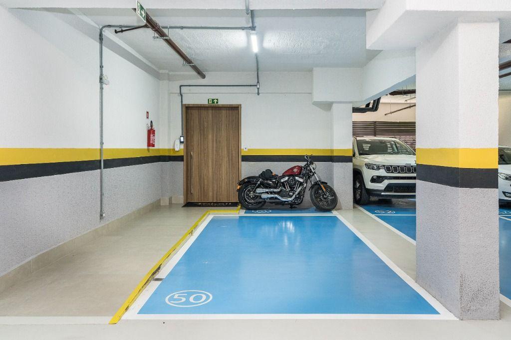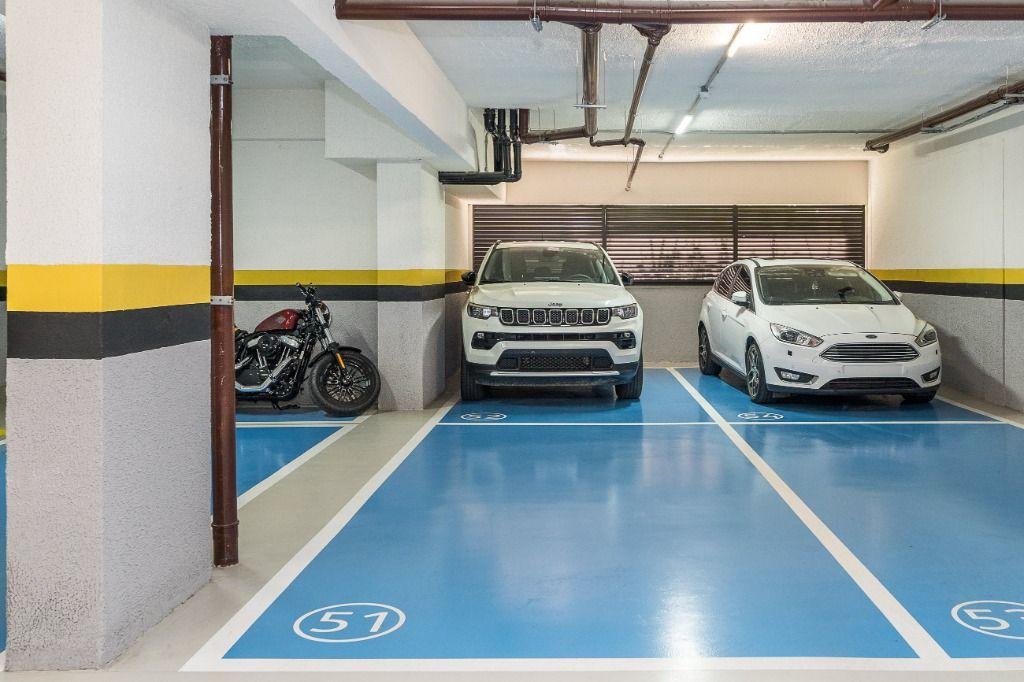 São 3 vagas de garagem cobertas sendo 01 dupla, 01 livre e uma adicional para moto, com carregador para carros elétricos.