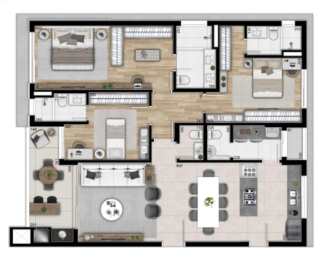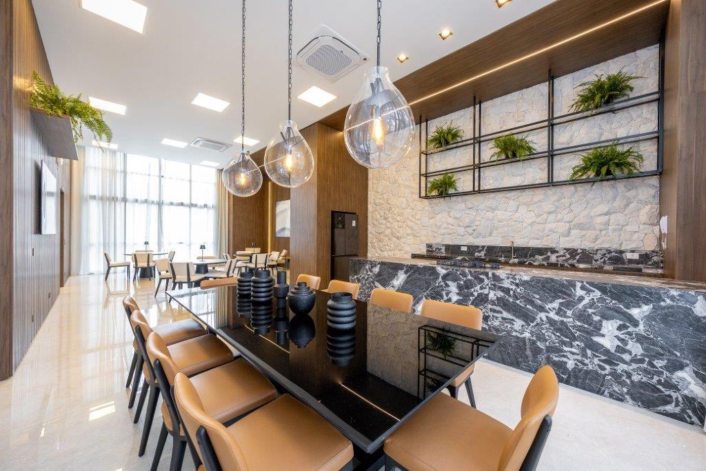 Apartamento novo com 3 suítes, ampla sala para 3 ambientes integrada a cozinha e a churrasqueira, sacada, lavabo, área e bwc de serviço. 2 vagas de garagem 74/75. Apartamento de frente, face Oeste. Excelente padrão com : Infra estrutura completa para ar condicionado nas dormitórios e sala, forro em gesso drywall, guilhotina na porta social dos apartamentos pra melhorar o desempenho acústico, parede de divisas com alto desempenho acústico, pintura epóxi dos pisos das garagens, porcelanato 90x90 na área social dos apartamentos, churrasqueira à carvão, metais monocomando nos BWCs dos apartamentos, sistema de segurança - CFTV do condomínio entregue instalado, persianas integradas e automatizadas nos dormitórios, ralo linear na área do box dos bwc, nicho de mármore na Suíte Master, infraestrutura para coifa,