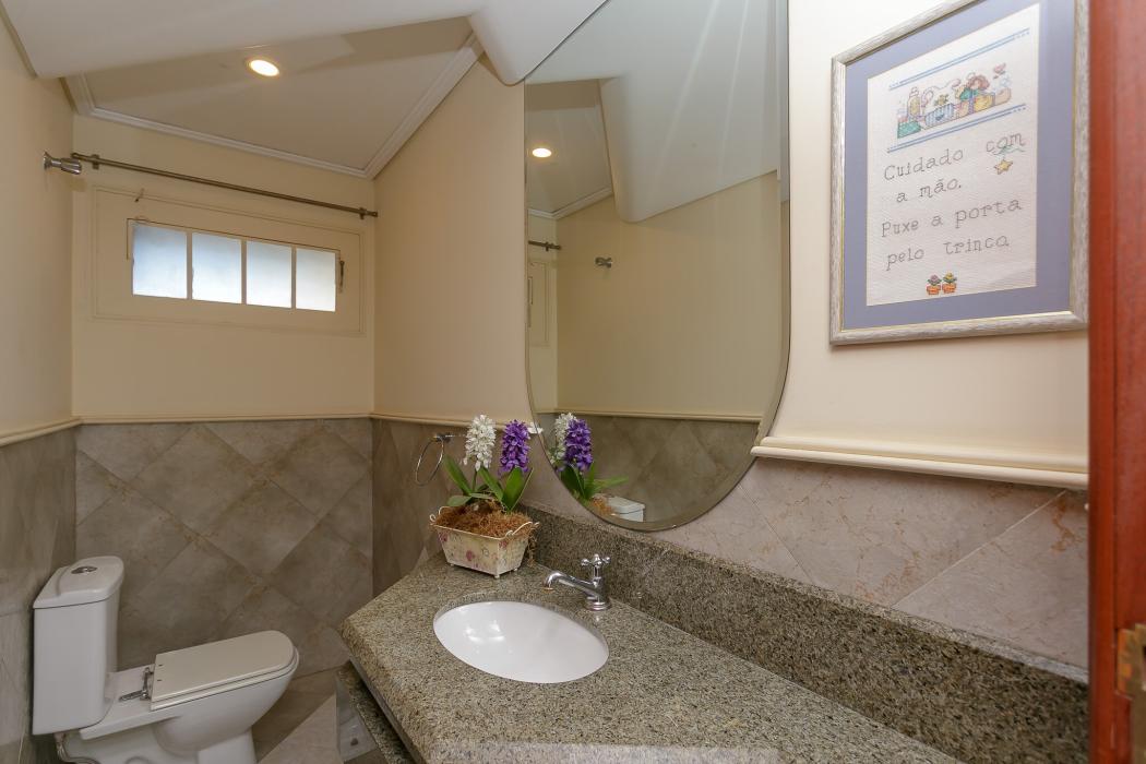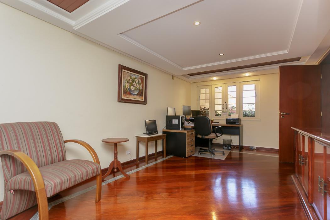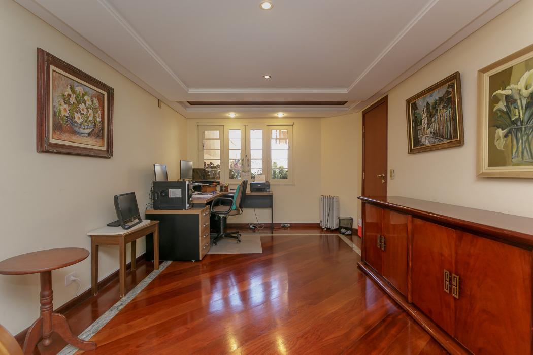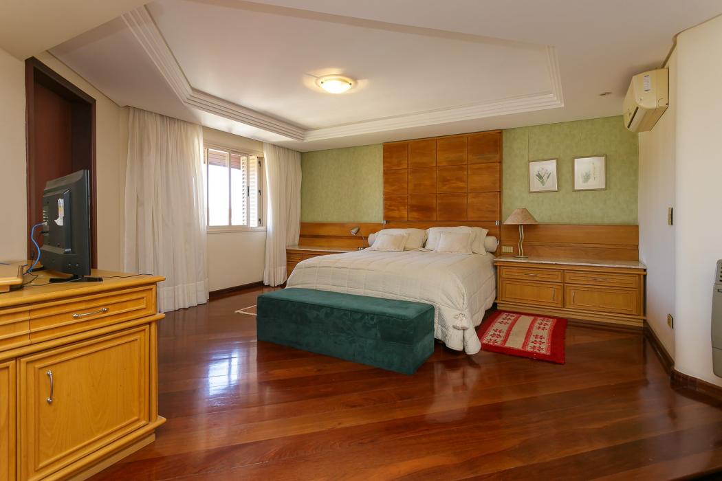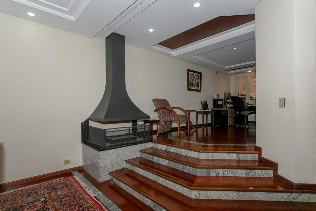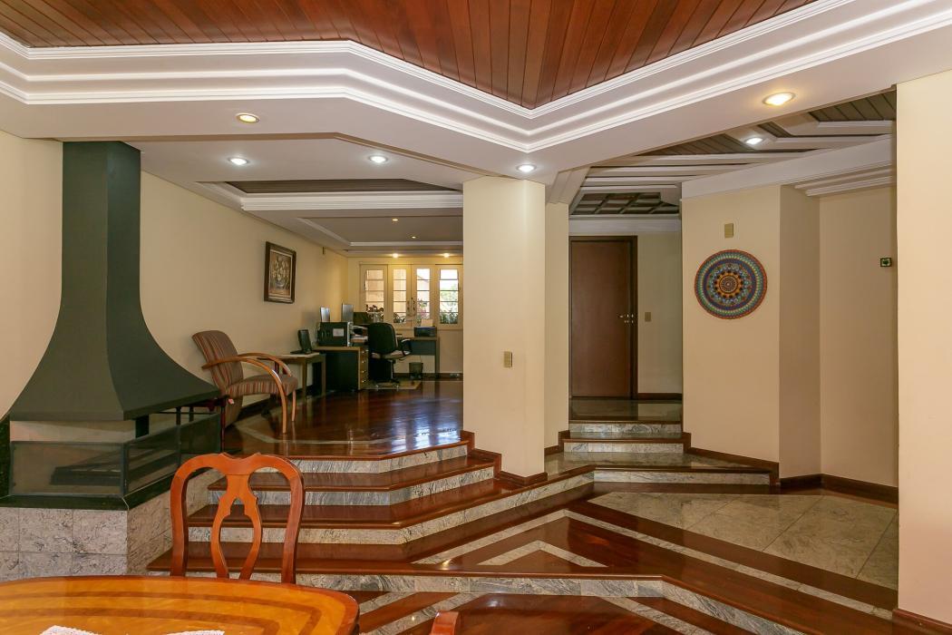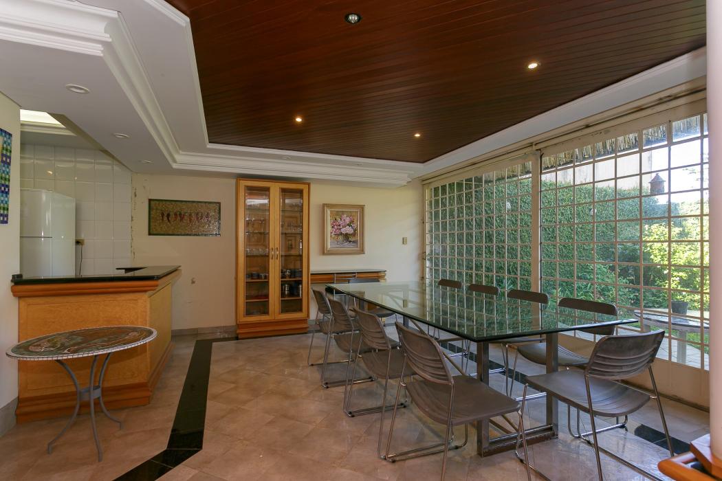 Com 603 m2, três salas com lareiras, adega, copa, cozinha, suíte com 02 closet, 05 quartos sendo 03 suítes, ático, salão de festas com churrasqueira, terraços, jardim, suíte de empregada, oficina, garagem para 06 carros.