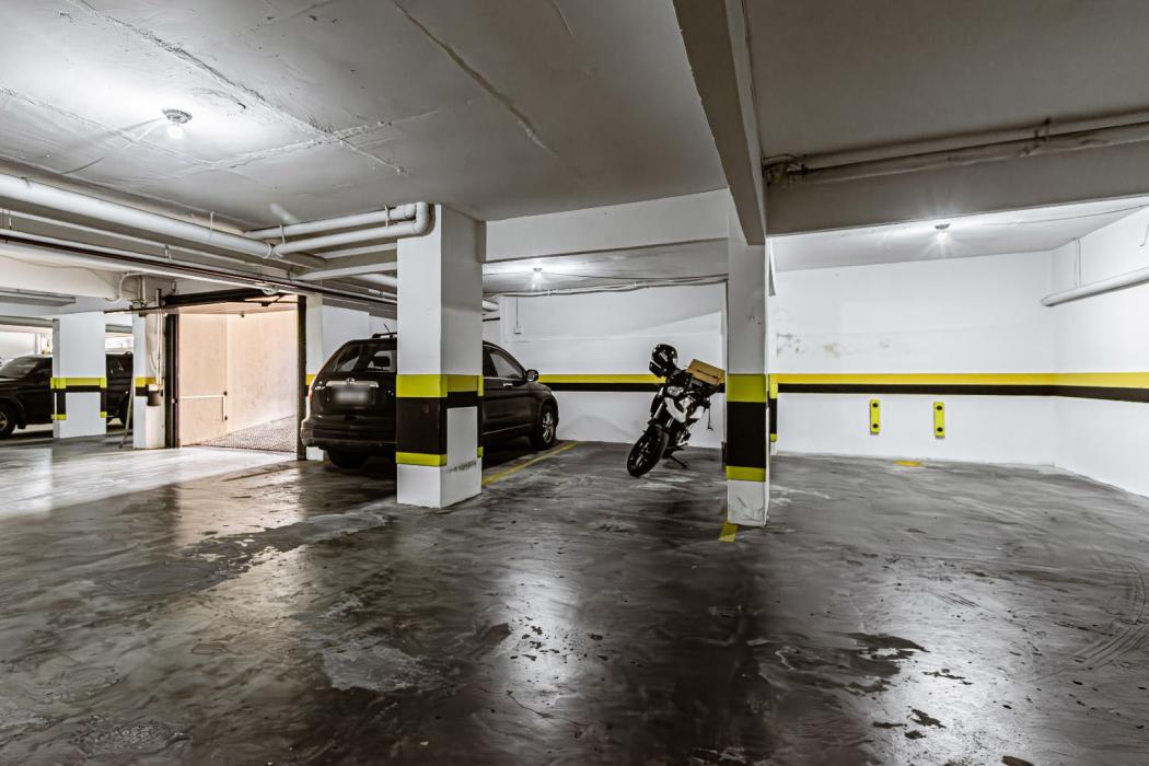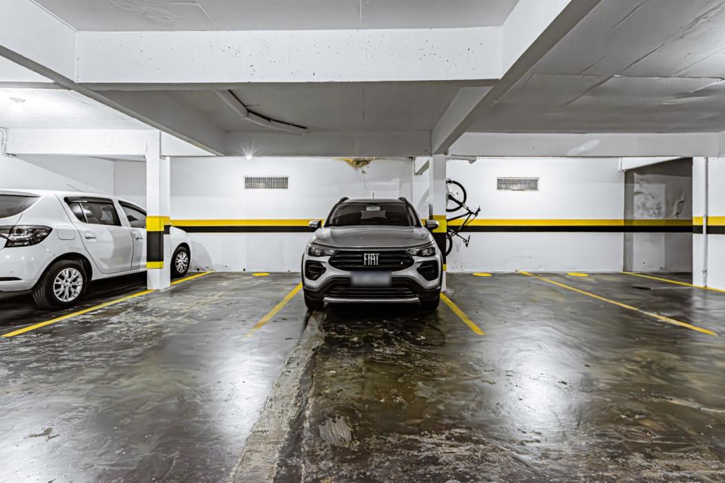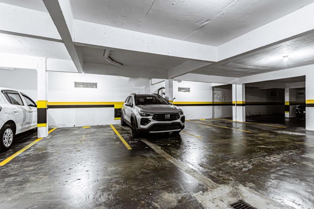 O apartamento conta com 2 vagas de garagem cobertas, demarcadas e livres.