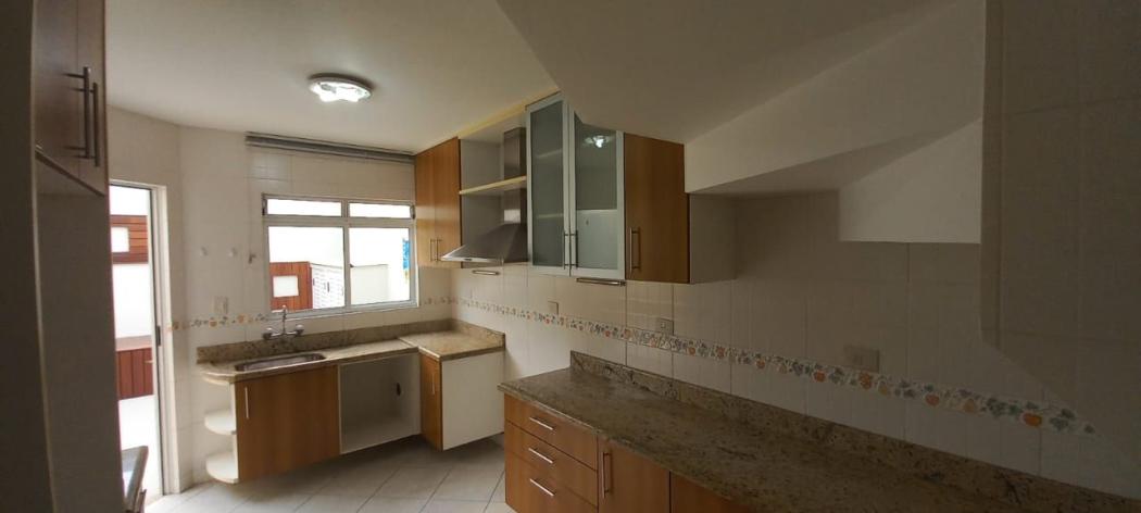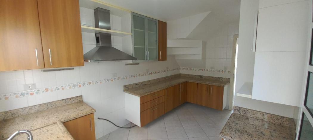 Cozinha com armários, tampo em granito e coifa;
