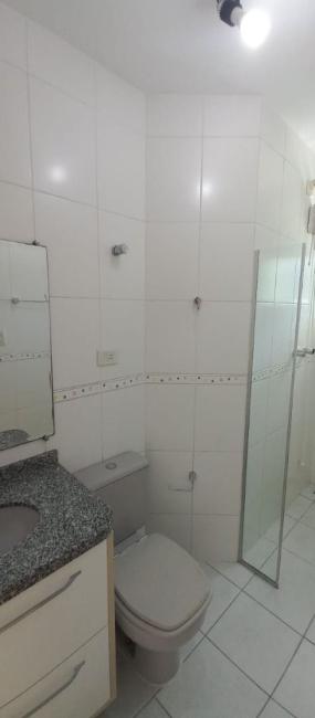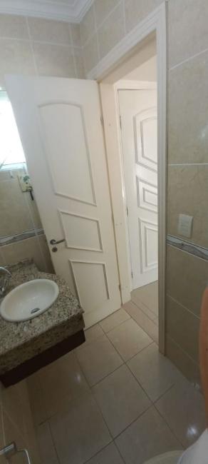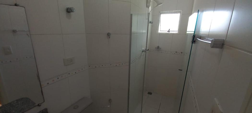 Banheiro social gabinete com tampo em granito e box em vidro;